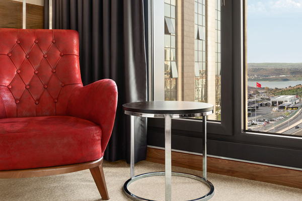 Ramada Hotel Beylikdüzü is a modern and stylish accommodation located in a vibrant area of Istanbul. The hotel offers spacious and comfortable rooms with contemporary furnishings, such as plush red armchairs and sleek furniture. Guests can enjoy panoramic city views from the large windows. The hotel also features dining options like the WYN Restaurant, ample parking, and close proximity to major attractions and business centers, making it an ideal choice for both leisure and business travelers.